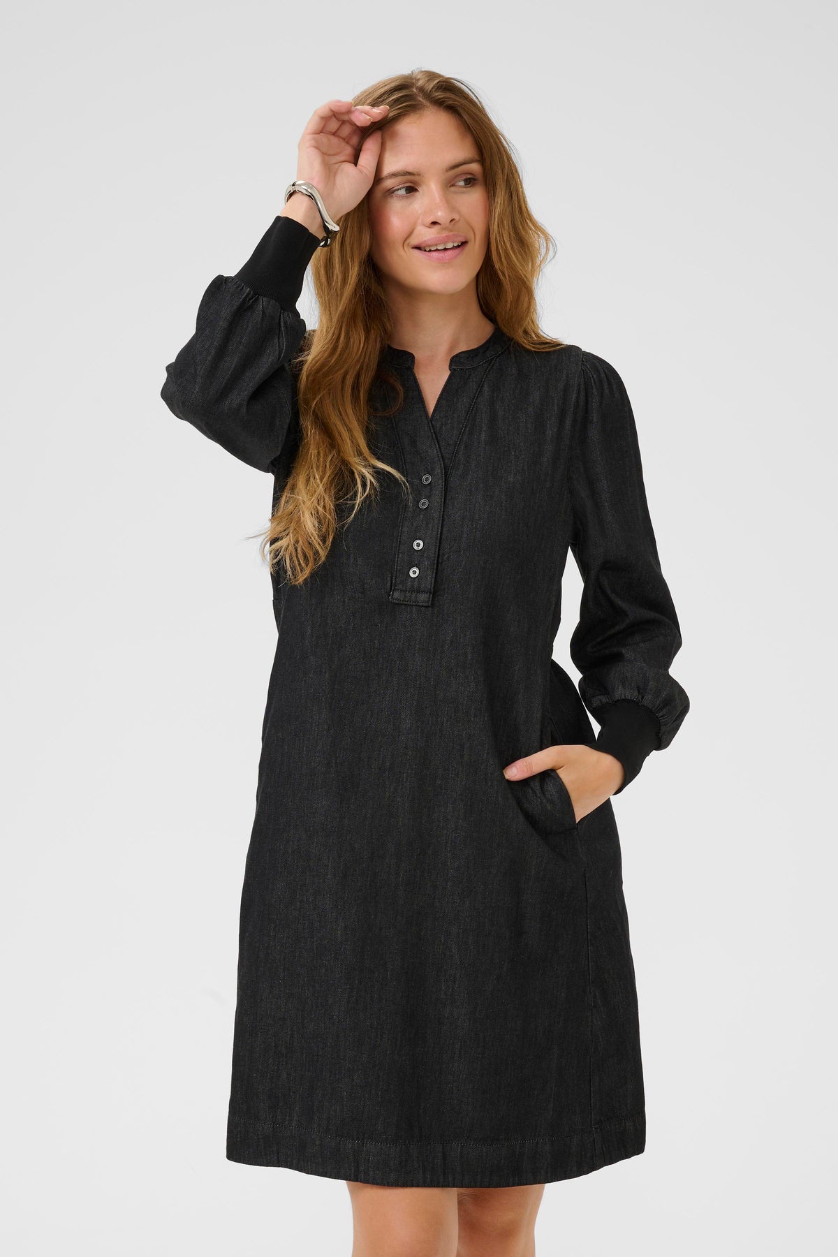 This shirt dress features a relaxed fit and knee-length silhouette for versatile style. Designed with a round V-neckline, long sleeves with cuffs, button placket, and side pockets for added comfort and functionality.