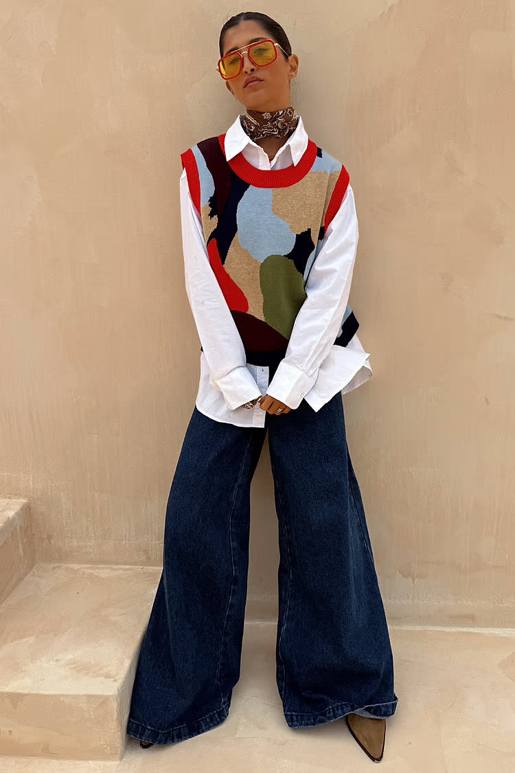 This multi coloured abstract print is the perfect way to add a pop of colour to your outfit!  A recoloured version of our iconic artist print, in a soft touch knit with a tassled hem and contrast red trim along the neckline adding an extra element of texture to the simple silhouette. Wear with the matching cardigan and skirt or over a shirt with some scallop jeans.