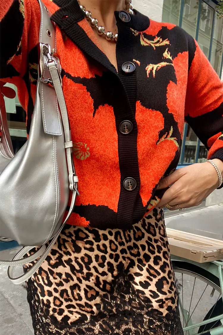The weighty, soft touch knit fabric makes this cardigan feel so luxe and premium! A black base with our iconic, bright and bold poppy print. With wide sleeves for a slightly oversized, boxy look and baby rib cuff and hem detailing, pair this cardi with some leopard jeans or thrown over the matching mesh dress for a classic day to night outfit.