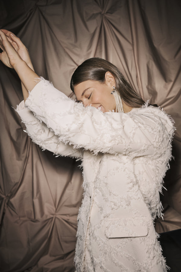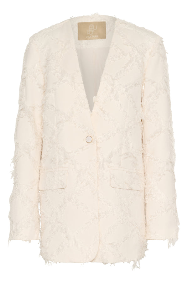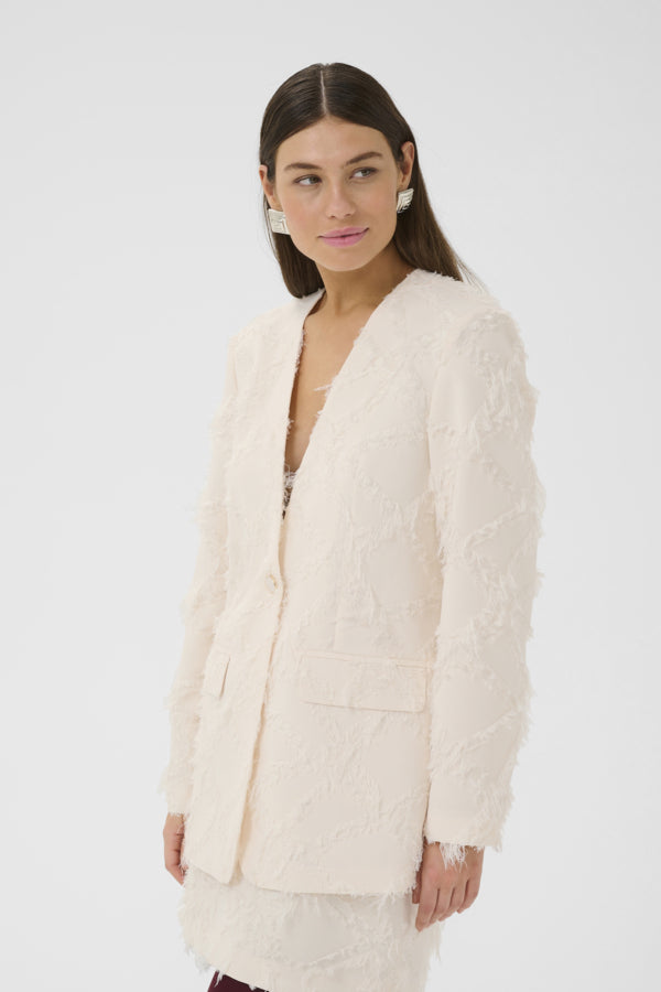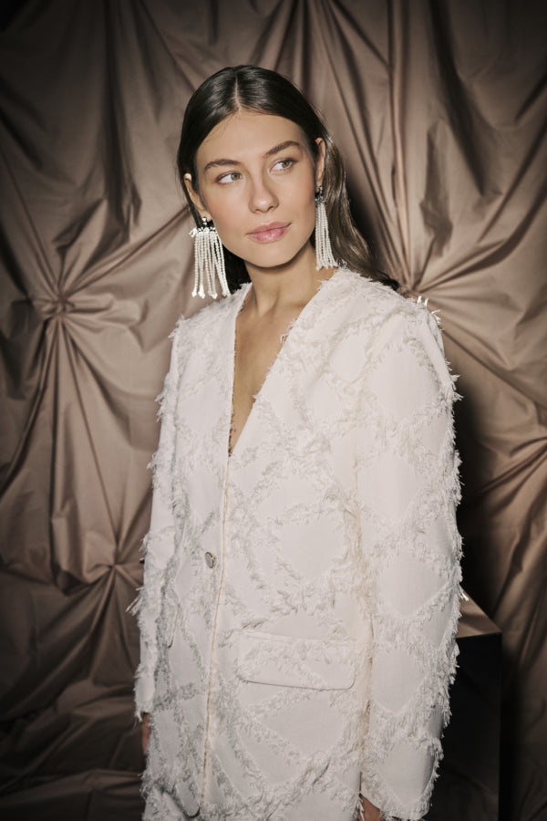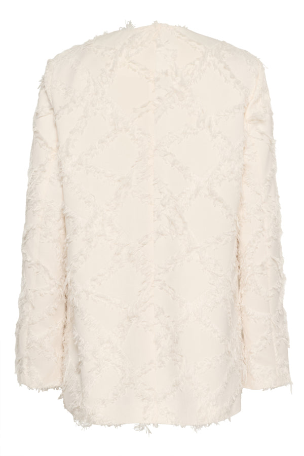 Textured blazer with a straight silhouette, featuring a single-button closure and raw-edge details throughout. Classic V-neckline and patch pockets complete this modern statement piece.