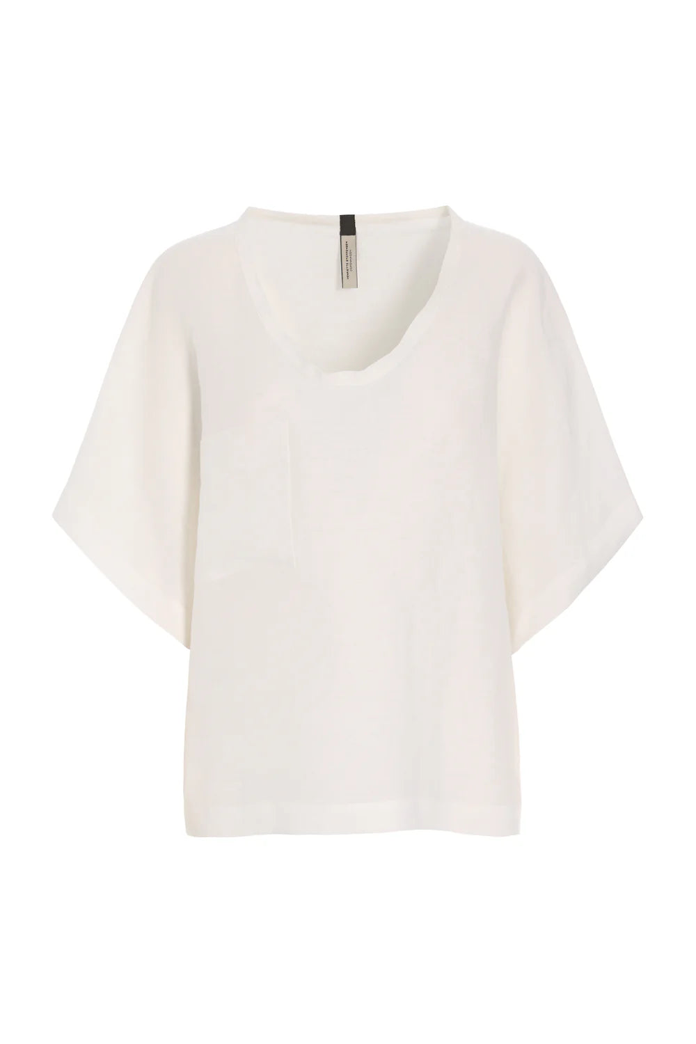 A cropped blouse with a relaxed, boxy shape and wide sleeves that reach around the elbow. The softly rounded neckline, sitting between a U-shape and a gentle scoop, brings lightness to the design.