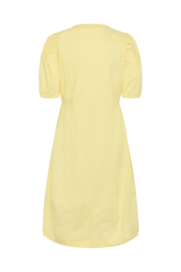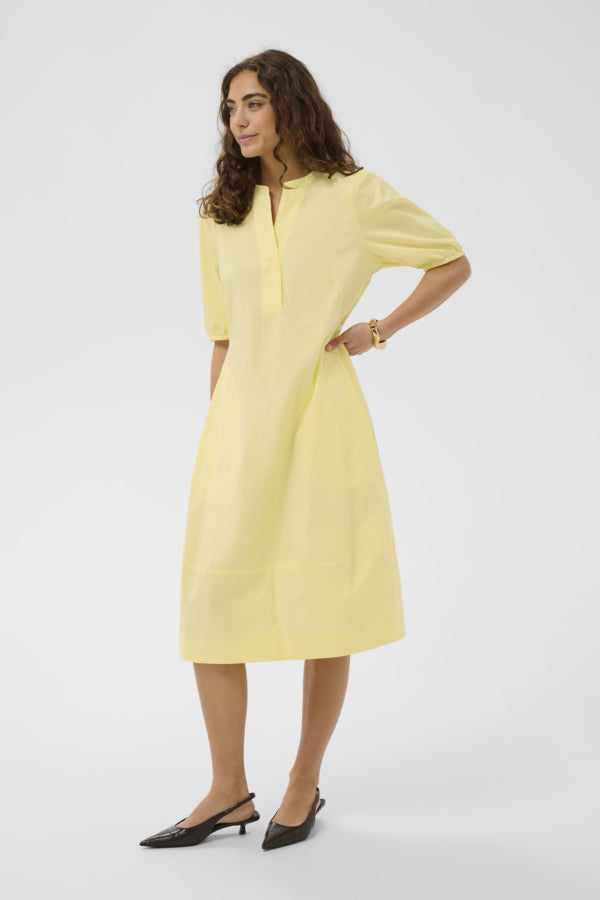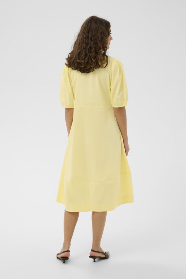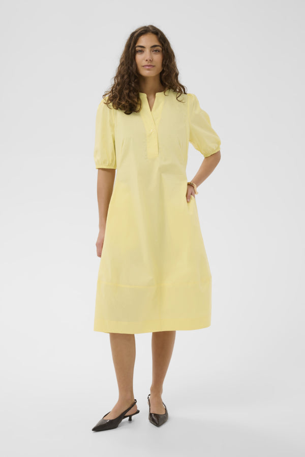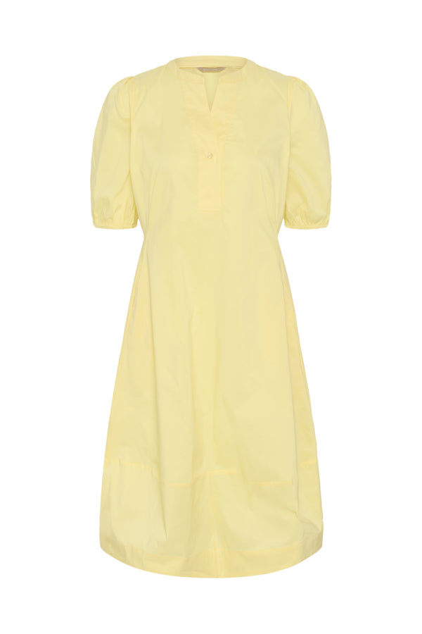 A relaxed A-line fit, V-neckline, short puff sleeves, and knee-length design. A versatile choice for routine elegance and comfort.