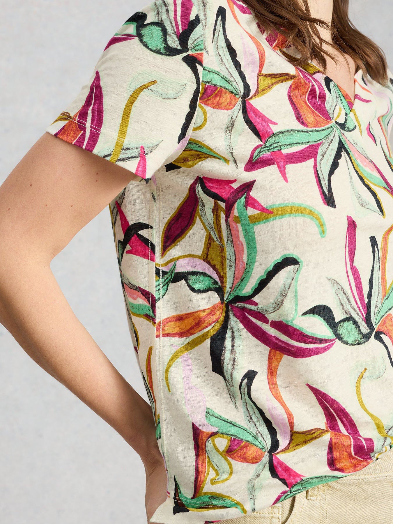 A v neck tee made from lightweight linen. The kind of top that loves warmer weather, weekend adventuring and being worn to brunch.