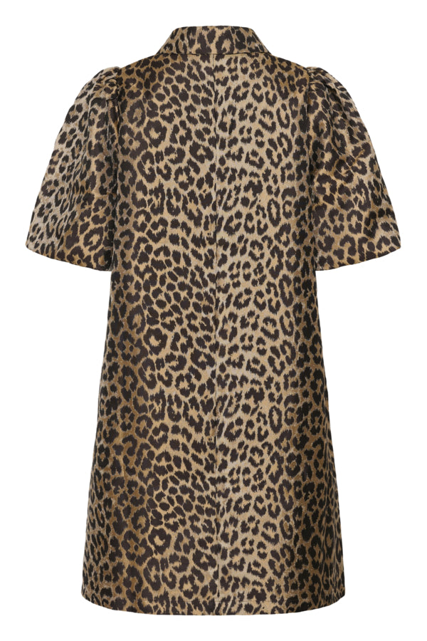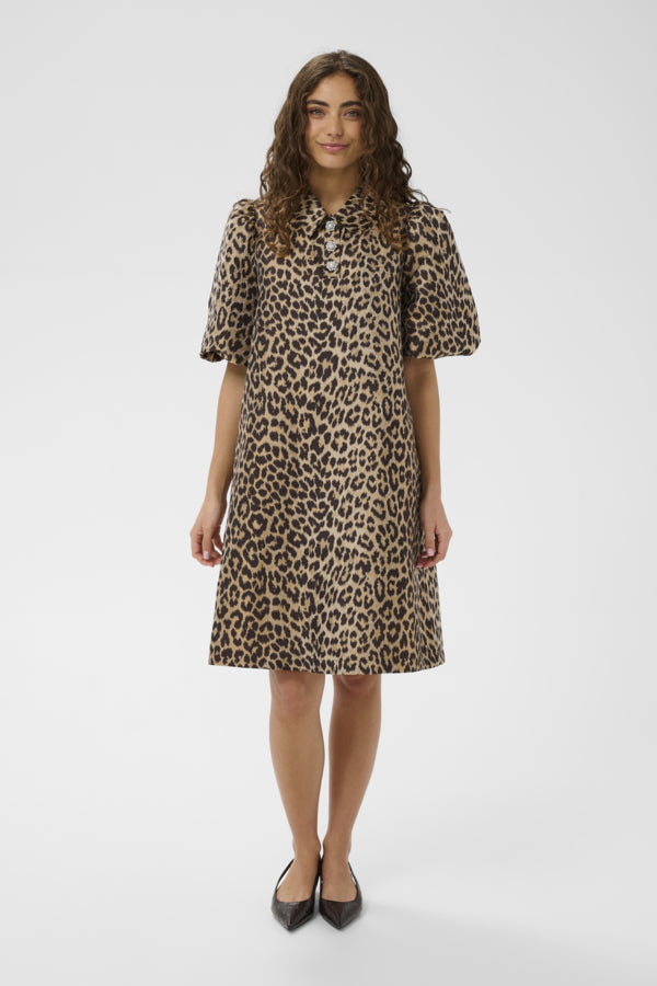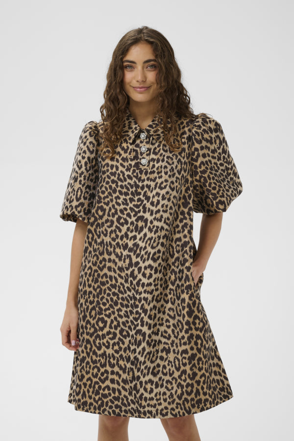 This A-line dress features a relaxed fit, short puff sleeves, and a classic collar detailed with decorative embellishments. The mid-thigh length and versatile silhouette ensure comfort and effortless style for any occasion.