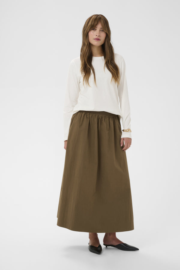 This A-line midi skirt offers a relaxed fit with an elastic waistband for all-day comfort. Designed with a flowing silhouette and versatile length, it transitions seamlessly from work to casual occasions.