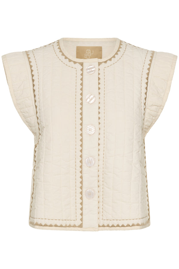 Embroidered vest with a straight silhouette, featuring a round neckline, button front, and structured cap sleeves. Distinctive floral embroidery adds texture to the crisp finish.