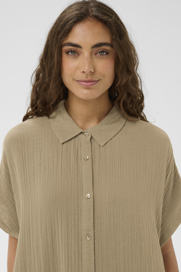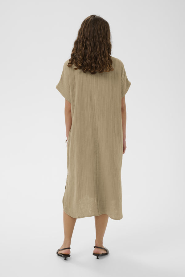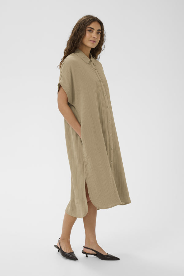 Shirt dress with a relaxed silhouette, collared neckline, full button-down front, and short, loose sleeves. Textured surface with a knee-length design adds effortless style.