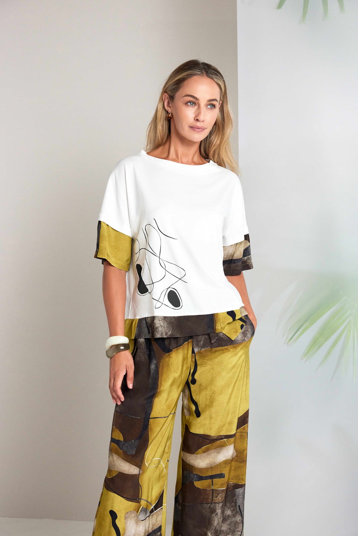 NAYA embrace colour and print with this lightweight, wide leg trouser. Starting with the pull up waistband the relaxed feel is carried through by the strong yet muted colour choice and a print that is fluid yet soft to the eye. Ensuring you will enjoy wearing this piece all summer long. #NAYA #NAYASTOCKIST #NAYAIRELAND #NAYAUK #IRISHDESIGN